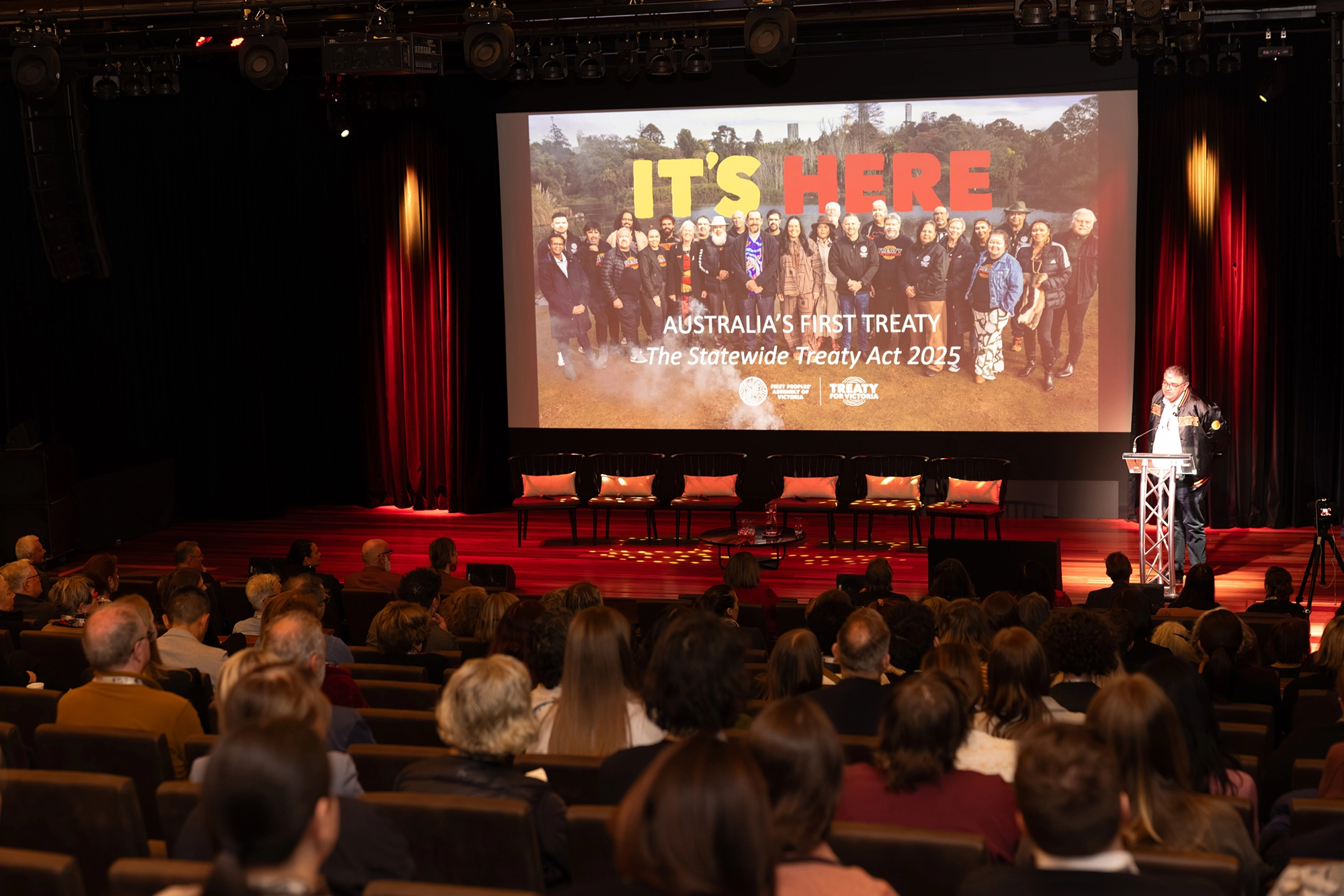 Damien Bell, CEO of First Peoples’ Assembly of Victoria presenting the keynote address. Photo © Medadesignau