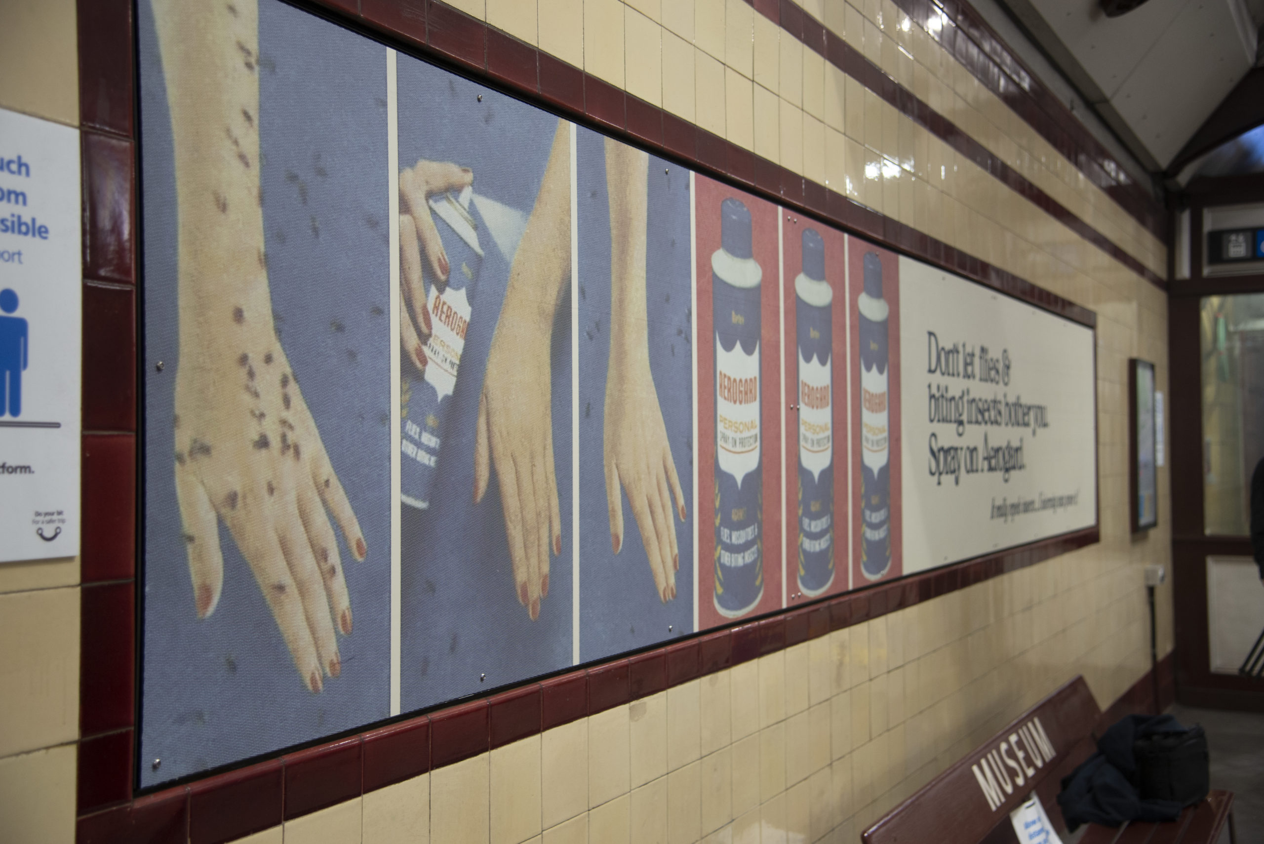 During installation we were excited to uncover original hand-painted Mark Foy’s signage. Following conservation work by International Conservation Services (ICS) the Foy’s department store signage is on permanent display interpreting the historic underground pedestrian connection between the former Piazza Store on Liverpool Street and Museum Station.